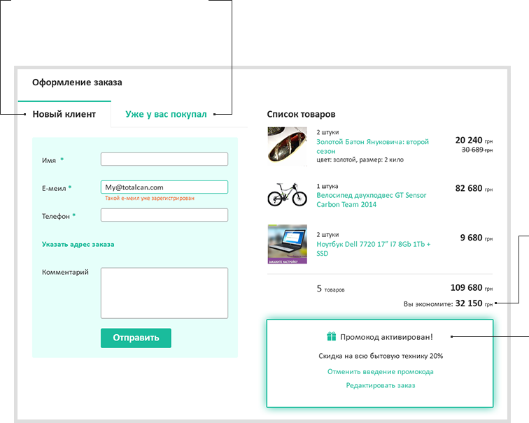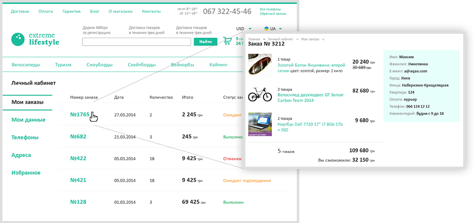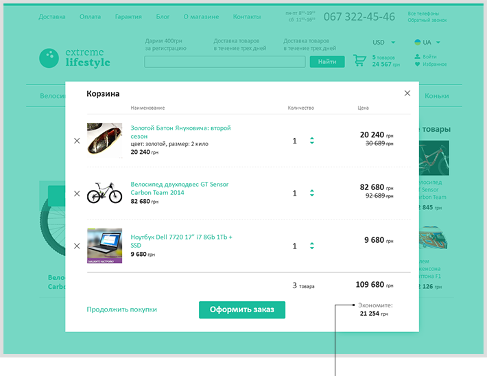 In the cart user will see the order list with all characteristics (color, size, unit price). Here the user can change the amount of products they want to buy or delete some of them from list. Also shown here is price and total cost.