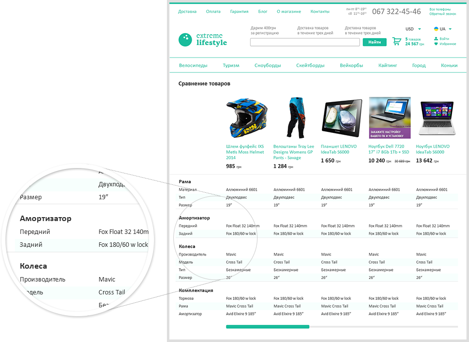 Products for comparison as well as their characteristics are displayed in the table and divided by category