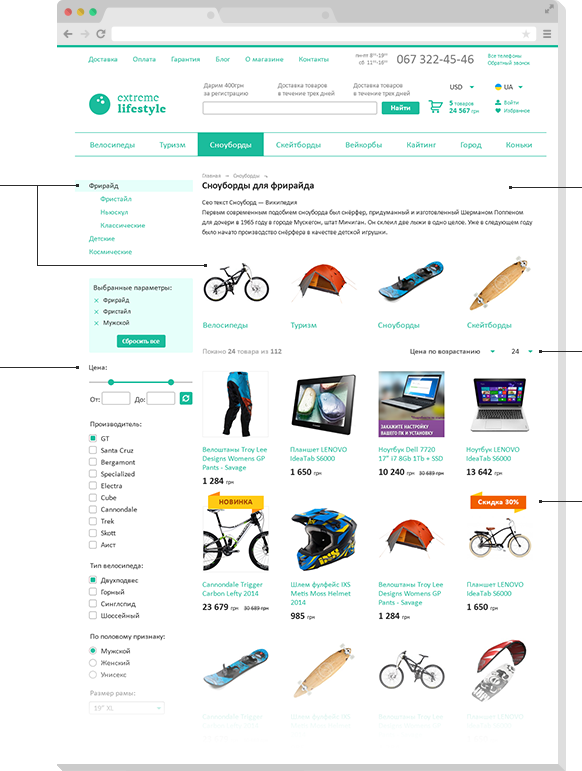 The filter allows choosing products according to parameters such as price, manufacturer, type, size and so on.
